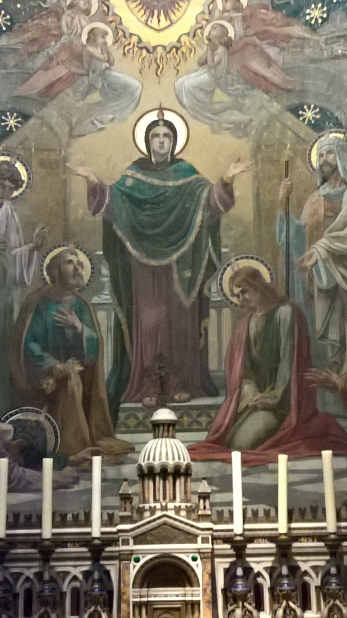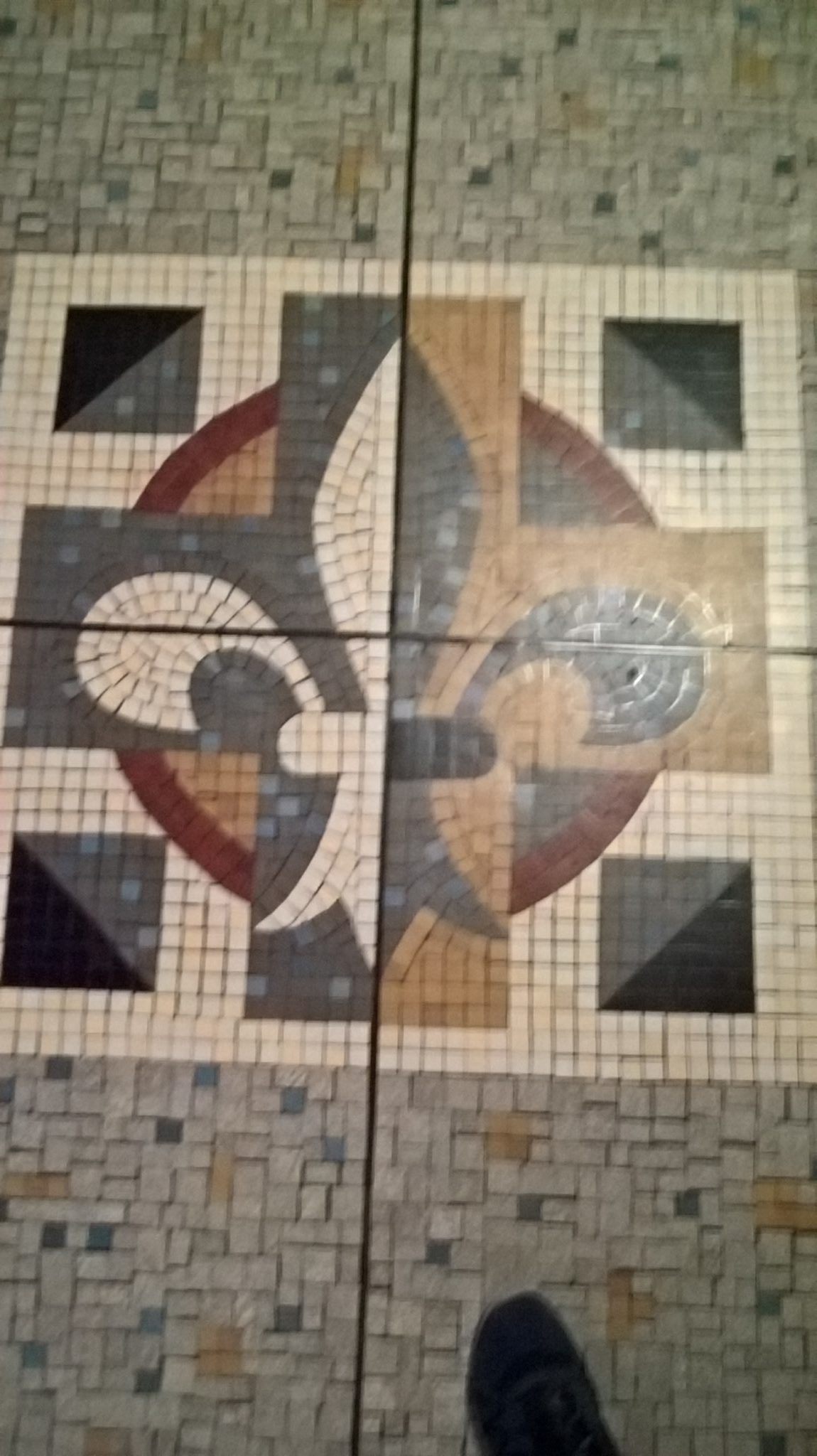 The actual grotto where the ‘visitations’ took place is still there with a statue of Mary in it with the Cathedrals/Basilicas built on top of the cliff over the grotto. The Sanctuary with the grounds and churches is wonderful. It is amazing to see how they built everything connected. Since it is on a cliff there are many stairs and ramps to get into the different levels. The thing that impressed me the most was the Our Lady (or Notre Dame) Basilica. All the decoration in it is mosaic—floors, ceilings, walls, etc. When you first walk in you think they are paintings but they are not—they are mosaics and each one was done by a different artist. They are magnificent. Even up close you want to call them paintings there is so much detail. I of course thought of quilters and piecing fabric!! So I am including some pictures of the floor.