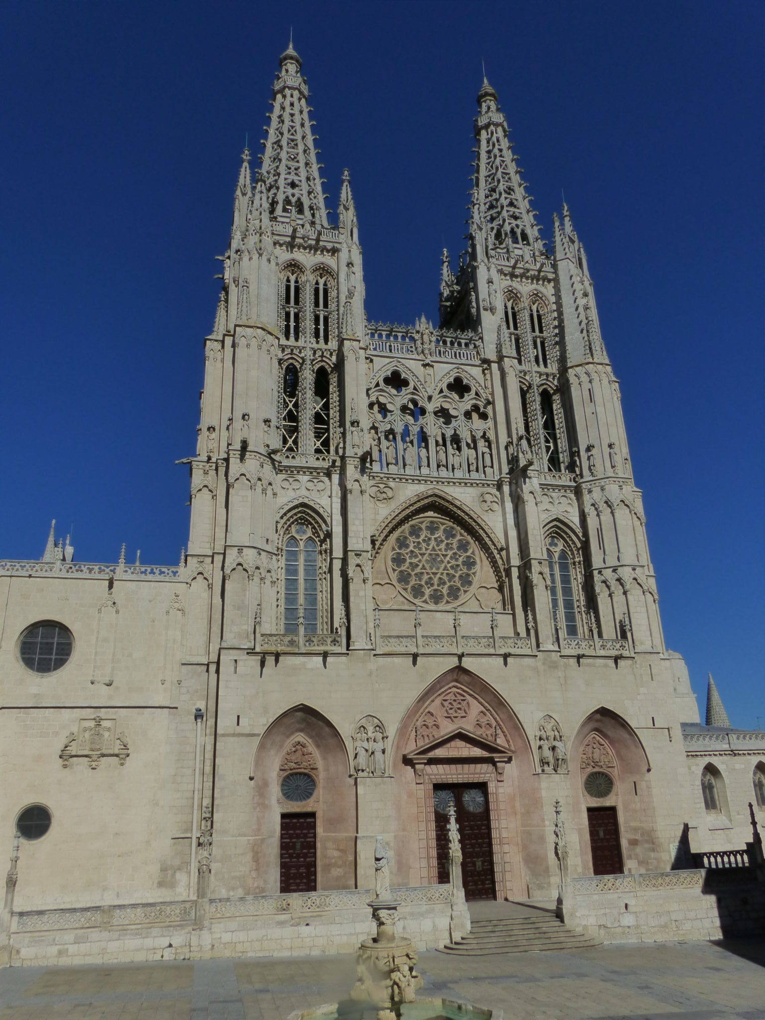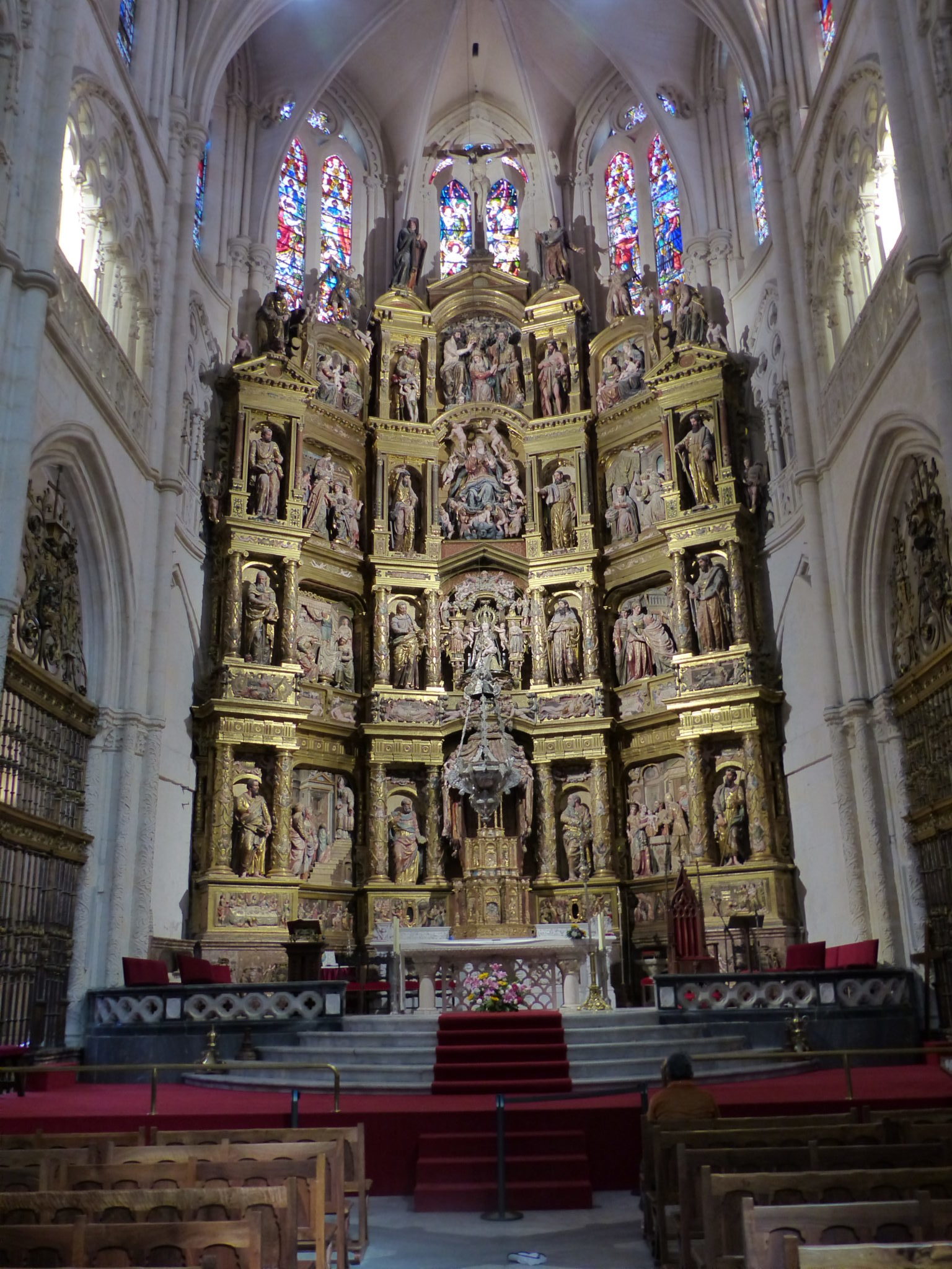 Anyway, our first stop was in Burgos, the home of the famous Spanish soldier of fortune, El Cid. His tomb lies directly beneath the main dome of the cathedral, one of the first gothic cathedrals in Spain and a World Heritage Site in its own right. While the exterior is rather ‘restrained’ and reminiscent of other gothic cathedrals in Europe, once you step inside, it’s all Spanish! The level of carved decoration is astounding; the main dome especially so. The ‘domes’ instead of being solid have glass in the area between the supporting vaults creating intricate eight pointed stars (Anne will have more on that). The side chapels off the aisles are as opulent as any I’ve seen and deserving of being churches in their own right, being dedicated to wealthy patrons or clerics. The Constable Chapel behind the apse has its own dome and is like a cathedral in a cathedral. Needless to say it’s hard to take it all in. We found Burgos to be an attractive city with some beautiful parks and walks along the river where the Spanish enjoy walking and visiting with friends on ‘Spanish Time’! Next it’s on to Salamanca.