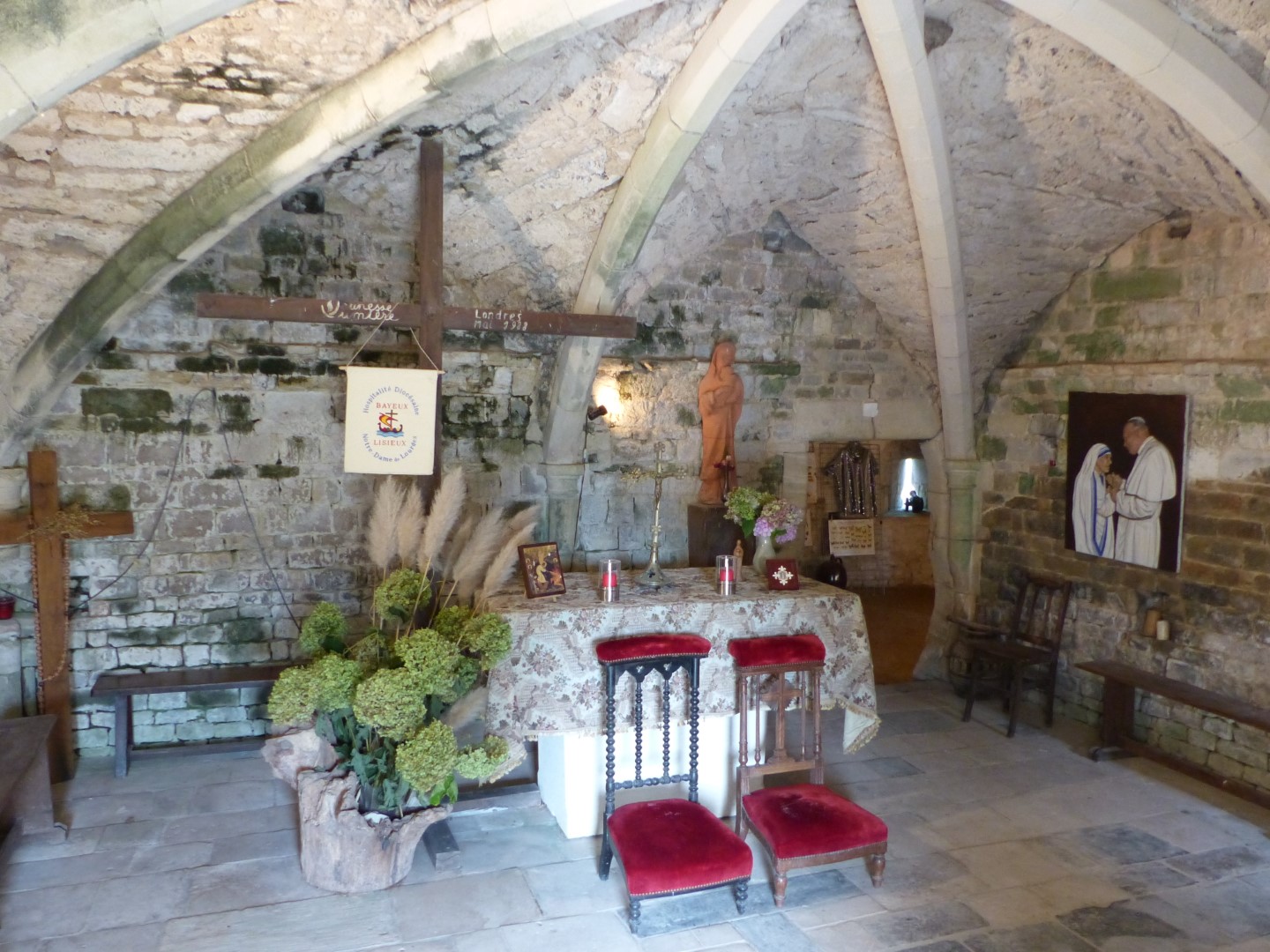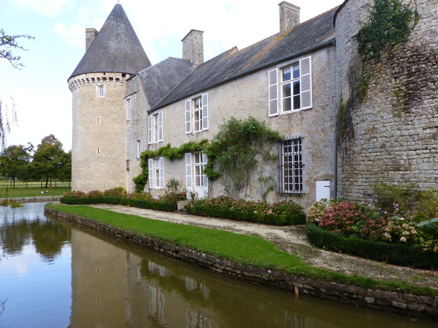 As an example that you don’t have to go far in Europe to find interesting historical places, we decided to go off the beaten path a bit.  We heard about a chateau just 5 km from the village where we were staying and set off down some narrow country lanes to find a beautiful medieval chateau, still privately owned and in pristine original condition, in the middle of the countryside.  The Chateau de Colombieres was built as a fortress castle as part of a line defending against English invasion during the Hundred Years War and during WWII was used by both the Germans and Allies as a headquarters for its location near the Normandy Beaches.  Later removal of one of the walls to open up the courtyard and Renaissance modifications have softened it to the imposing private residence it is today.