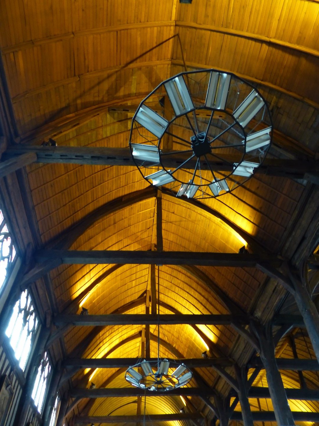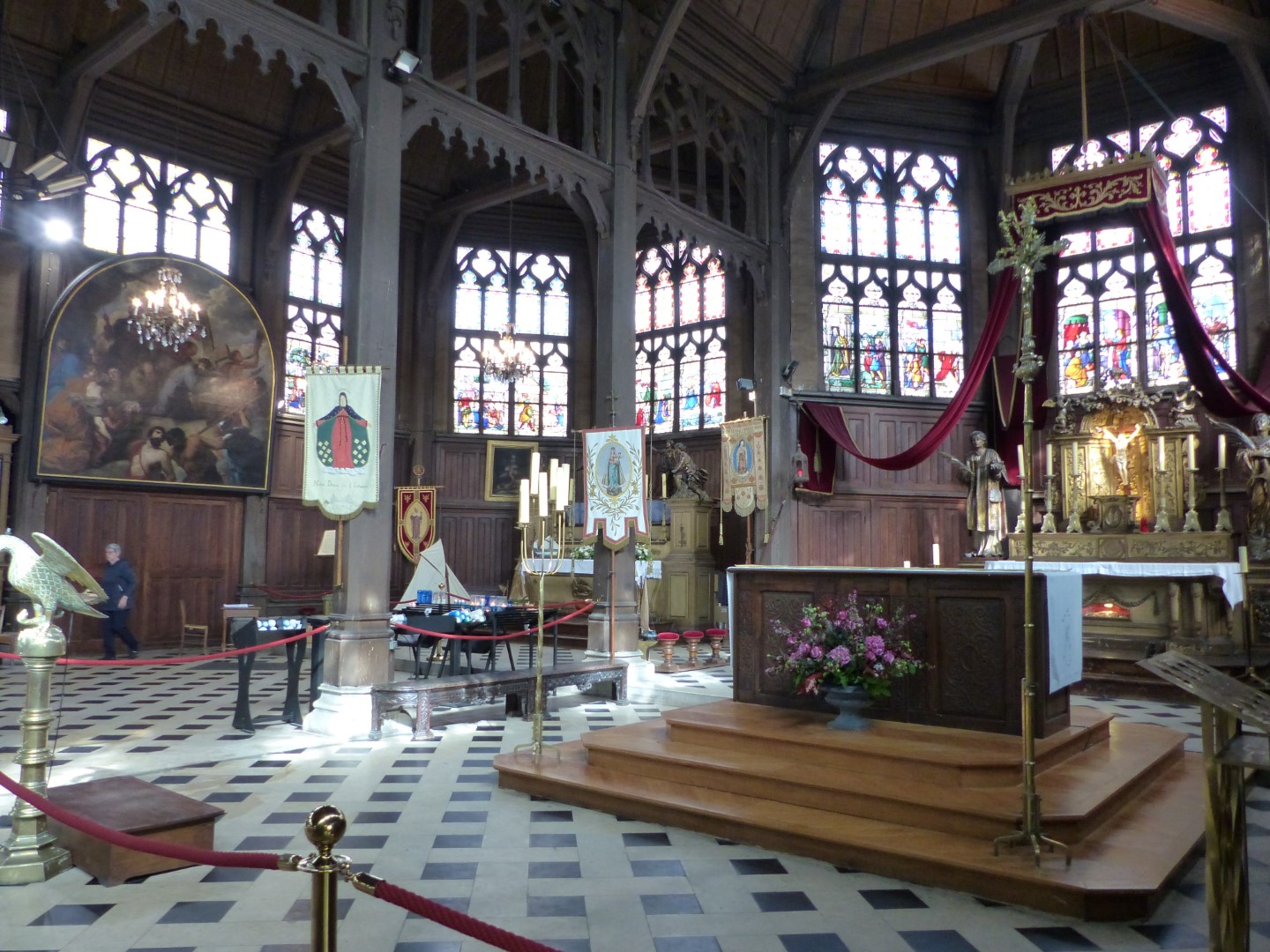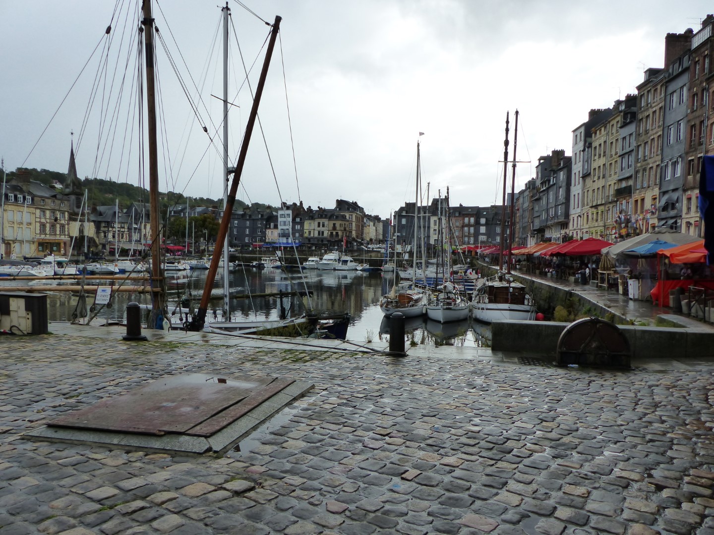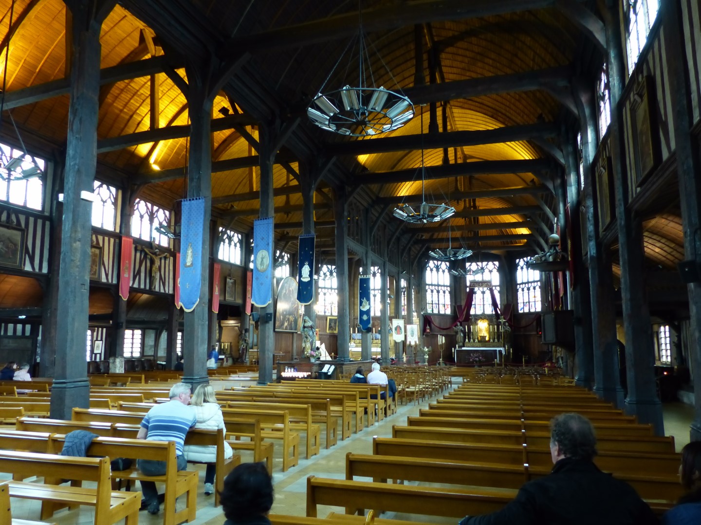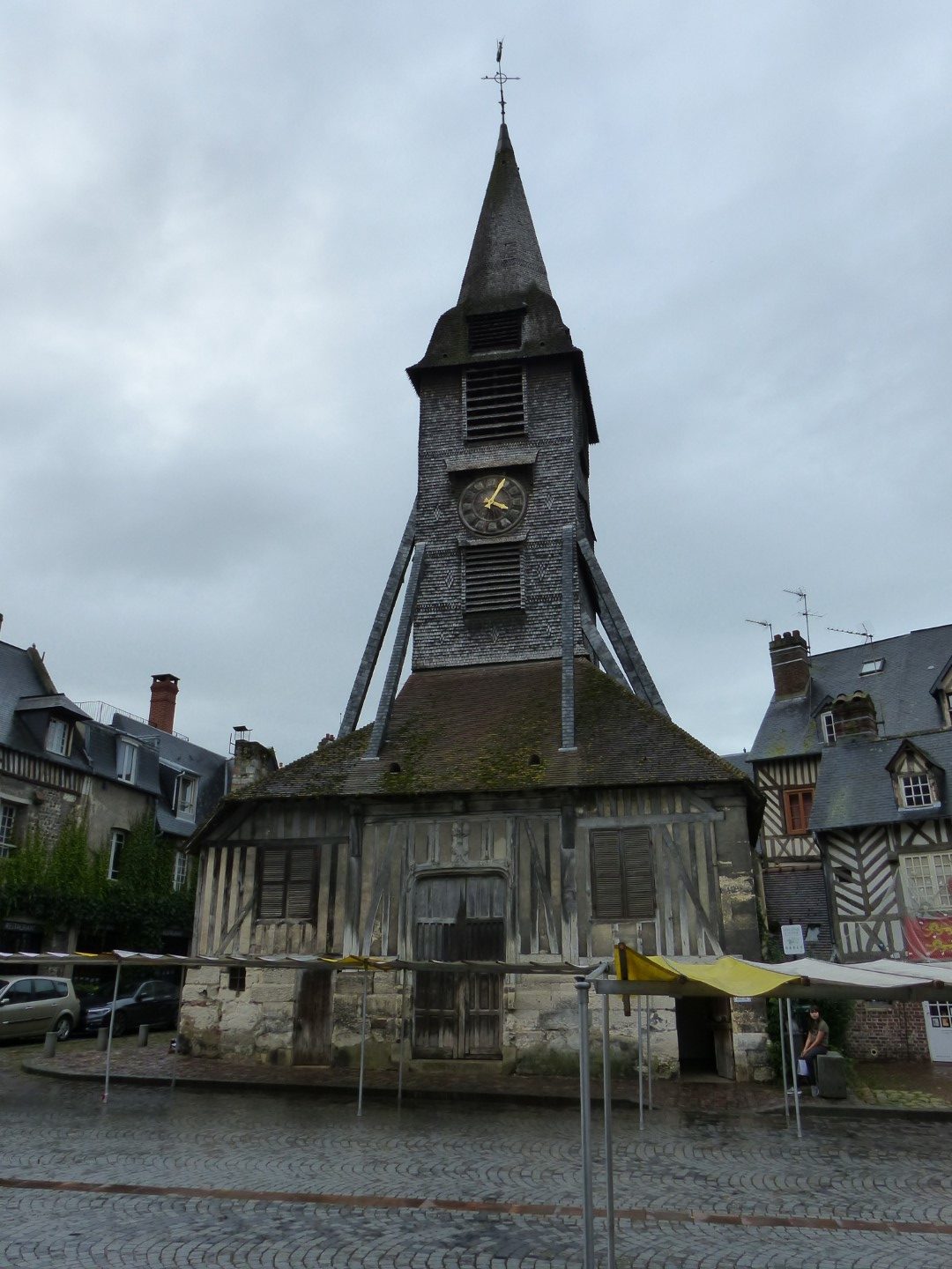 Honfleur is a picturesque fishing village on the south shore of the mouth of the Seine across from le Havre.  It’s especially known for its old port with its inner ‘View Basin’ around which tall, narrow, slate fronted houses cluster.  It’s been a favorite subject of painters for years, particularly of the impressionist movement.  And, while the weather wasn’t cooperating with intermittent rain, we did manage to explore the old town and the basin between showers.  One of the highlights of Honfleur is the Sainte-Catherine church, which is the largest wood church in France, and its separate bell tower.  The church was built by local shipwrights using naval construction techniques.  It was modeled on a market hall resulting in a church with two naves, each looking like upside down ship’s hulls from the inside.  It’s a striking building and a testament to the ship builders’ craftsmanship.  The neighboring bell tower was built separately for fire safety reasons and is equally unique.